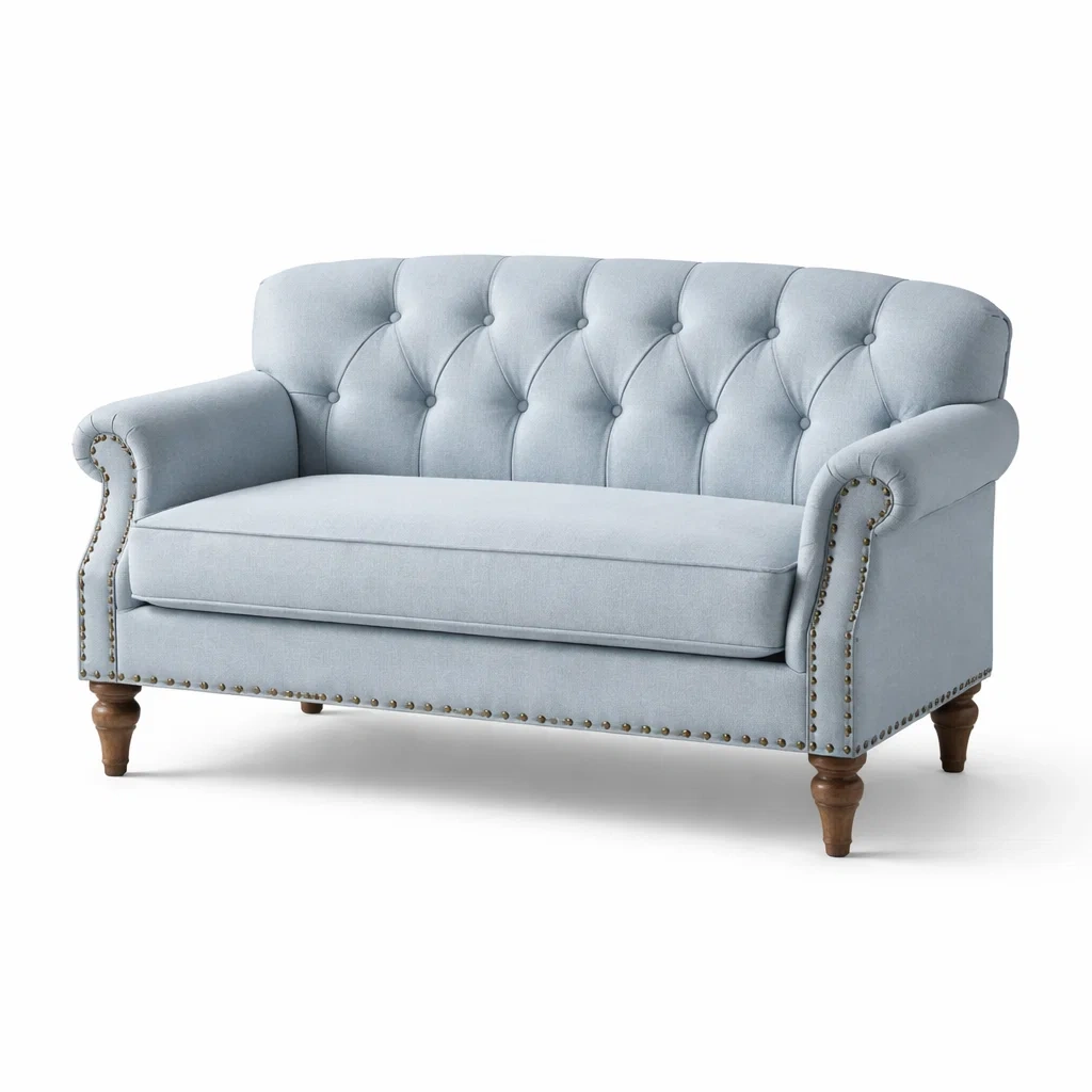 Canapé deux places en tissu lin bleu avec bois de hêtre