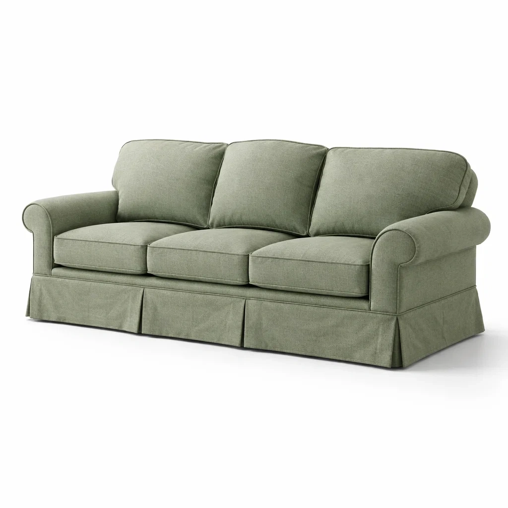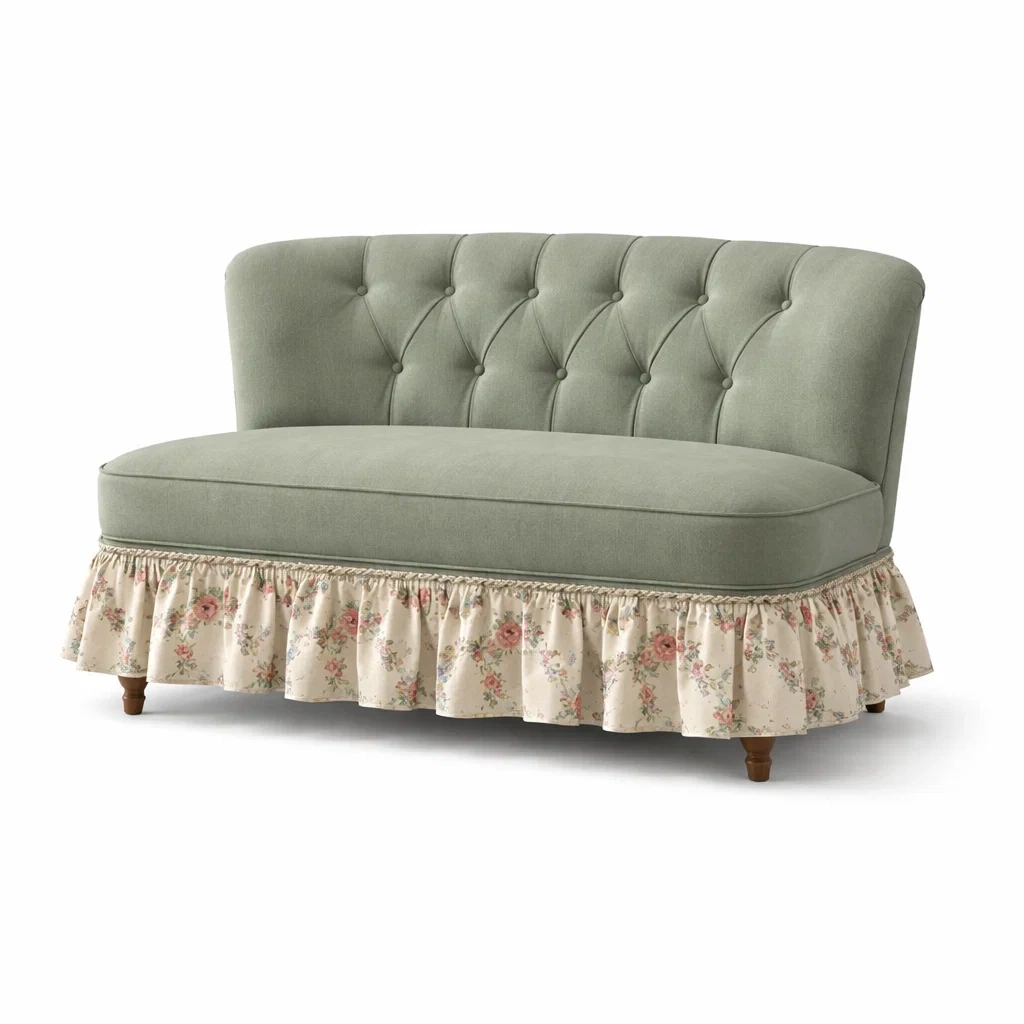Canapé deux places en tissu vert avec jupe florale