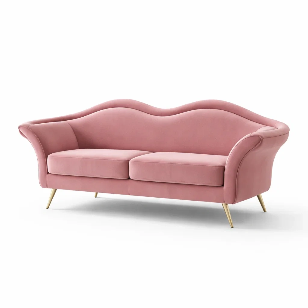 Canapé trois places en velours rose avec pieds en métal