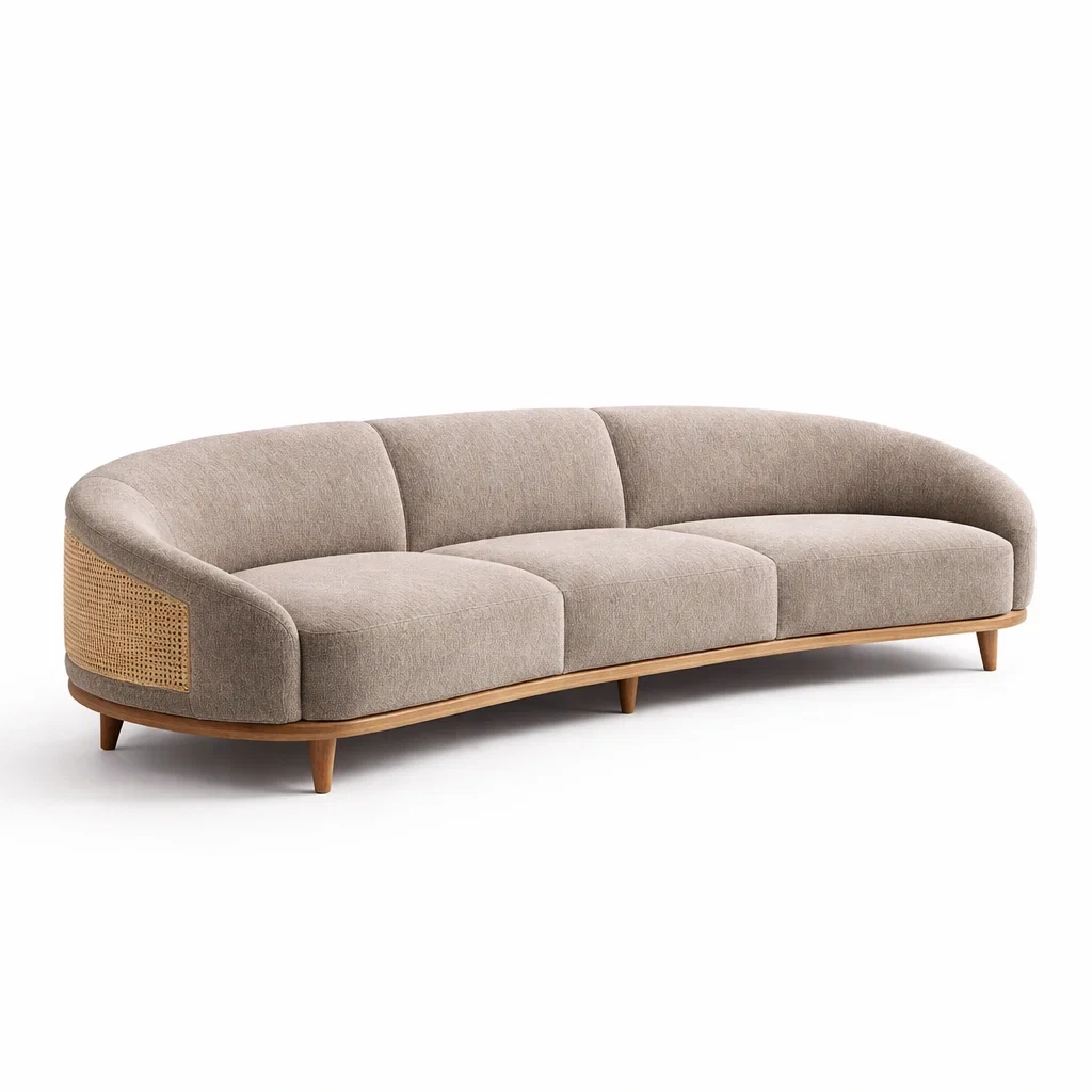 Canapé arrondi en tissu et bois avec accoudoirs en rotin