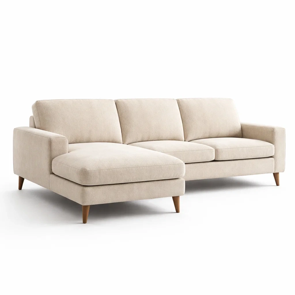 Canapé d’angle en tissu beige avec pieds en bois