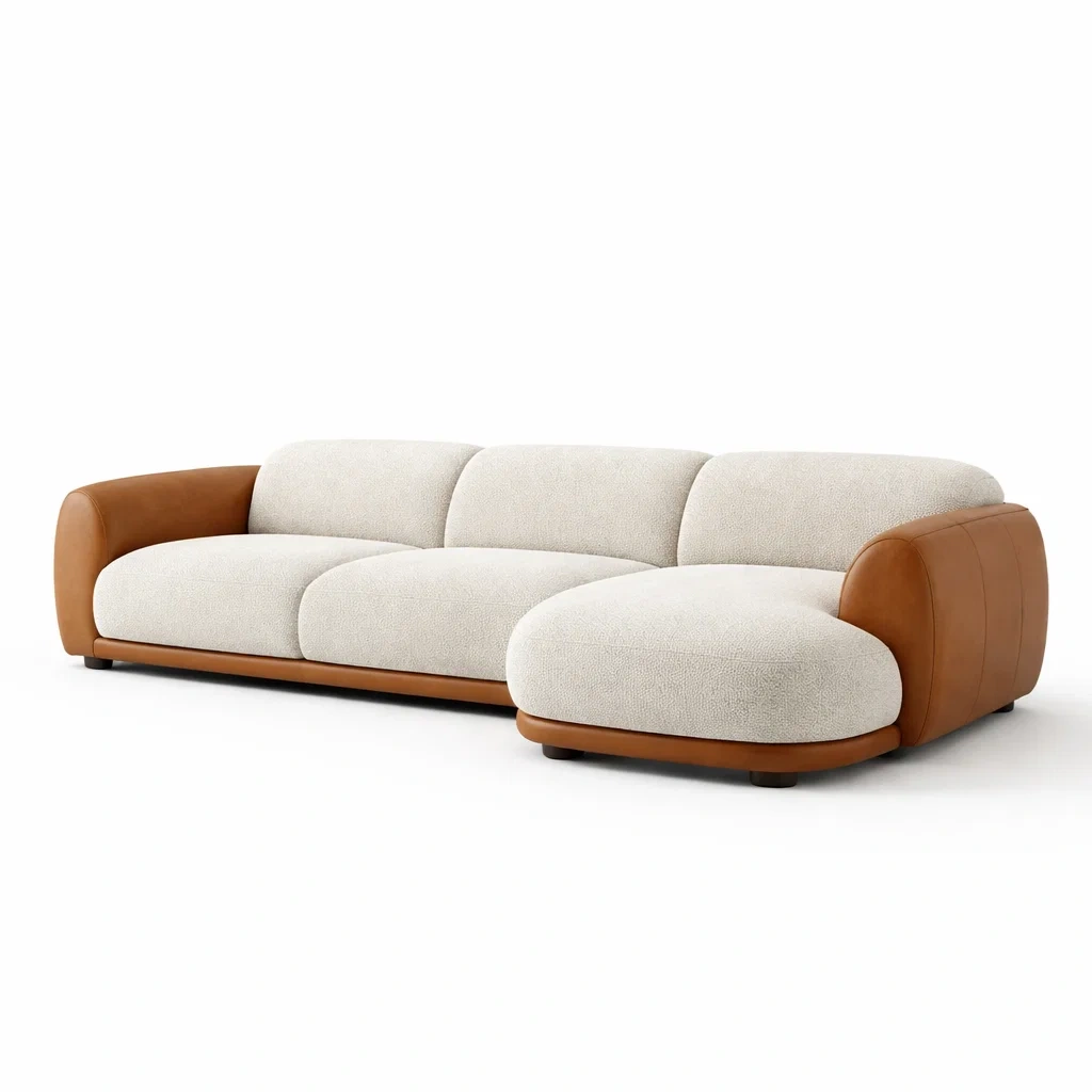 Canapé d’angle en tissu bouclé et cuir blanc et marron