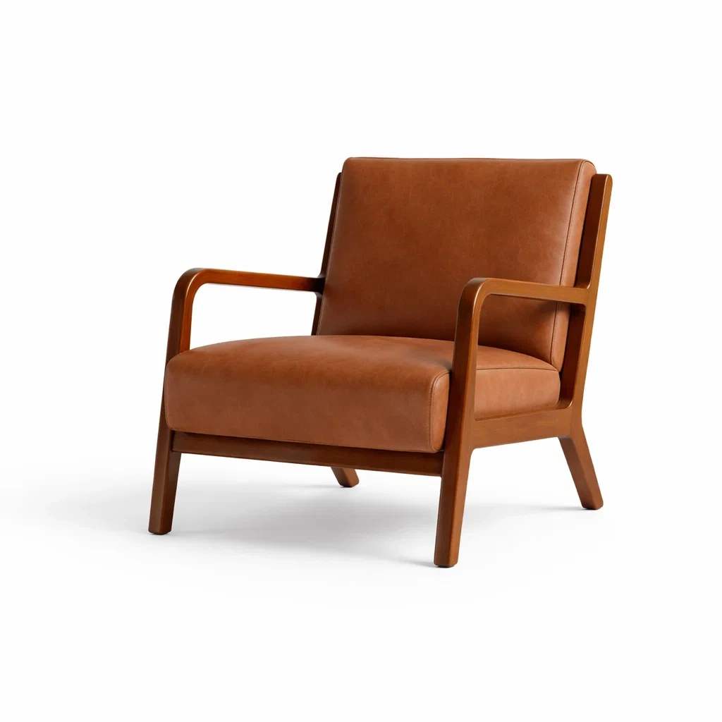 Fauteuil en cuir synthétique brun avec cadre en bois massif