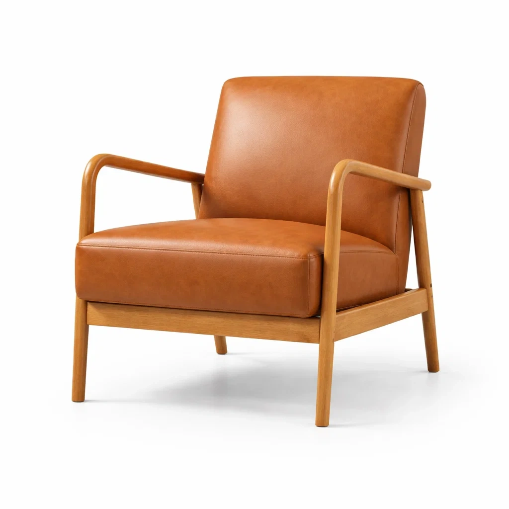 Fauteuil en cuir synthétique marron avec structure en métal et bois