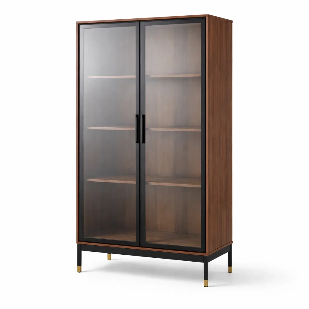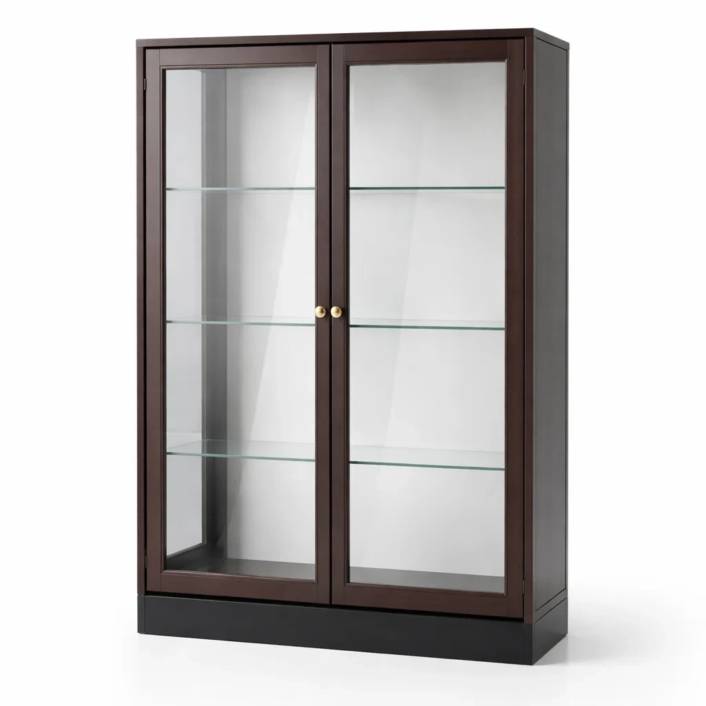 Vitrine en bois foncé avec portes en verre trempé et étagères
