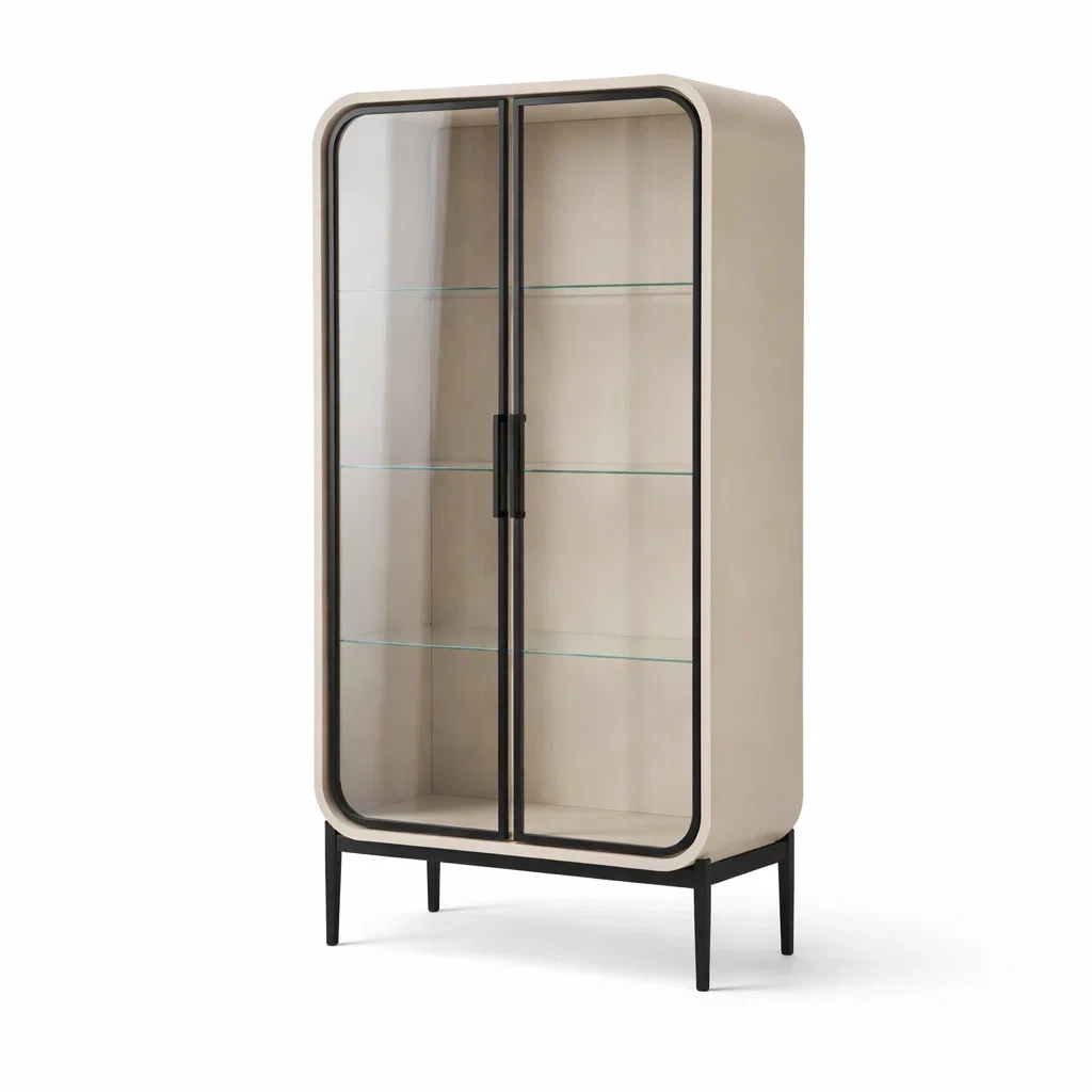 Vitrine en verre trempé avec cadre en métal et étagères multiples beige