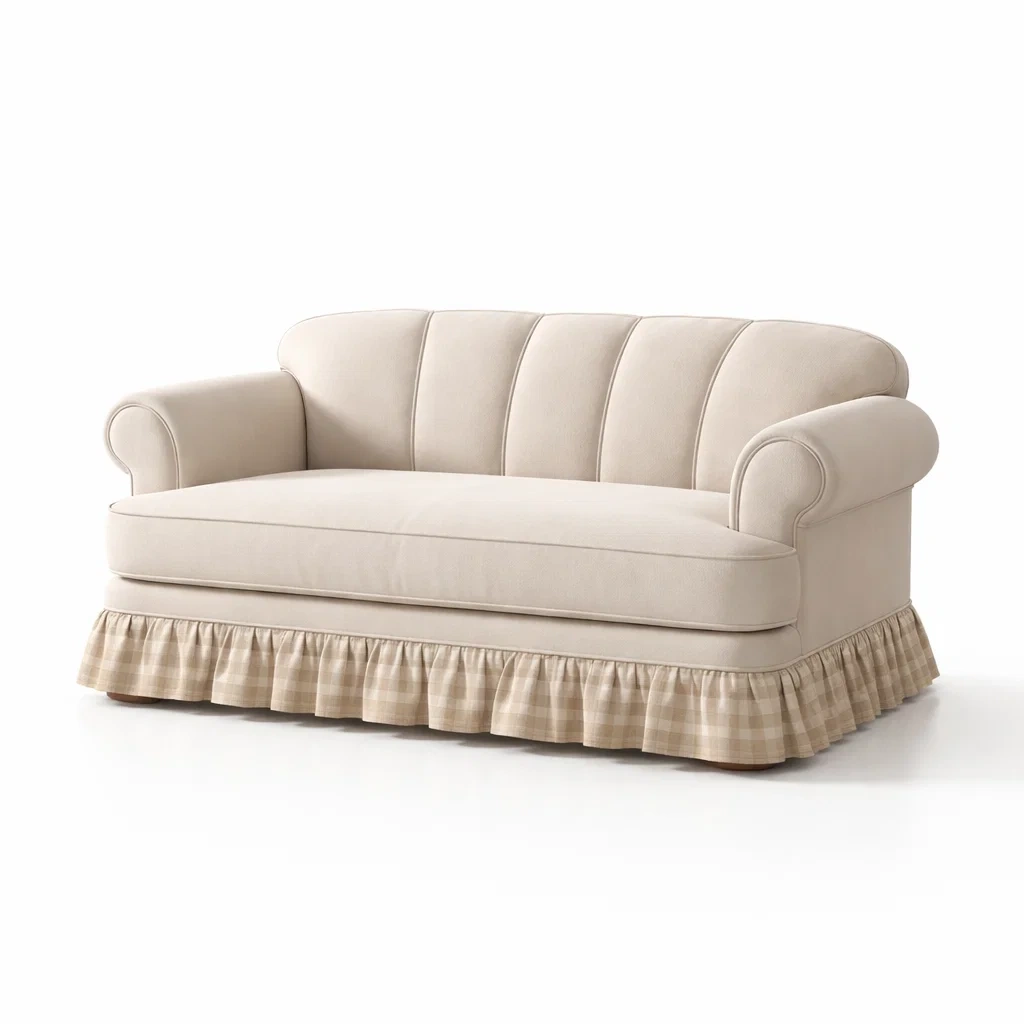 Ce canapé 2 places est fabriqué en coton et lin avec un rembourrage en mousse de polyuréthane. La structure est en bois massif. Il mesure 150 cm de long, 80 cm de large et 85 cm de haut, avec une hauteur d'assise de 45 cm et des accoudoirs à 60 cm. La couleur principale est Beige, avec une jupe à volants à carreaux. Capacité de charge maximale de 200 kg.