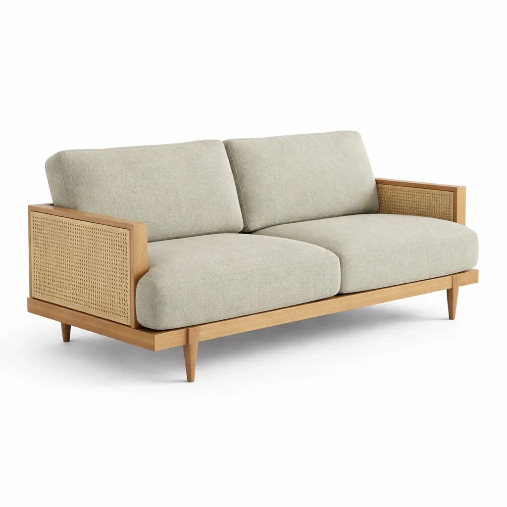 Matériaux : Structure en chêne massif, coussins en lin, panneaux latéraux en rotin tissé.