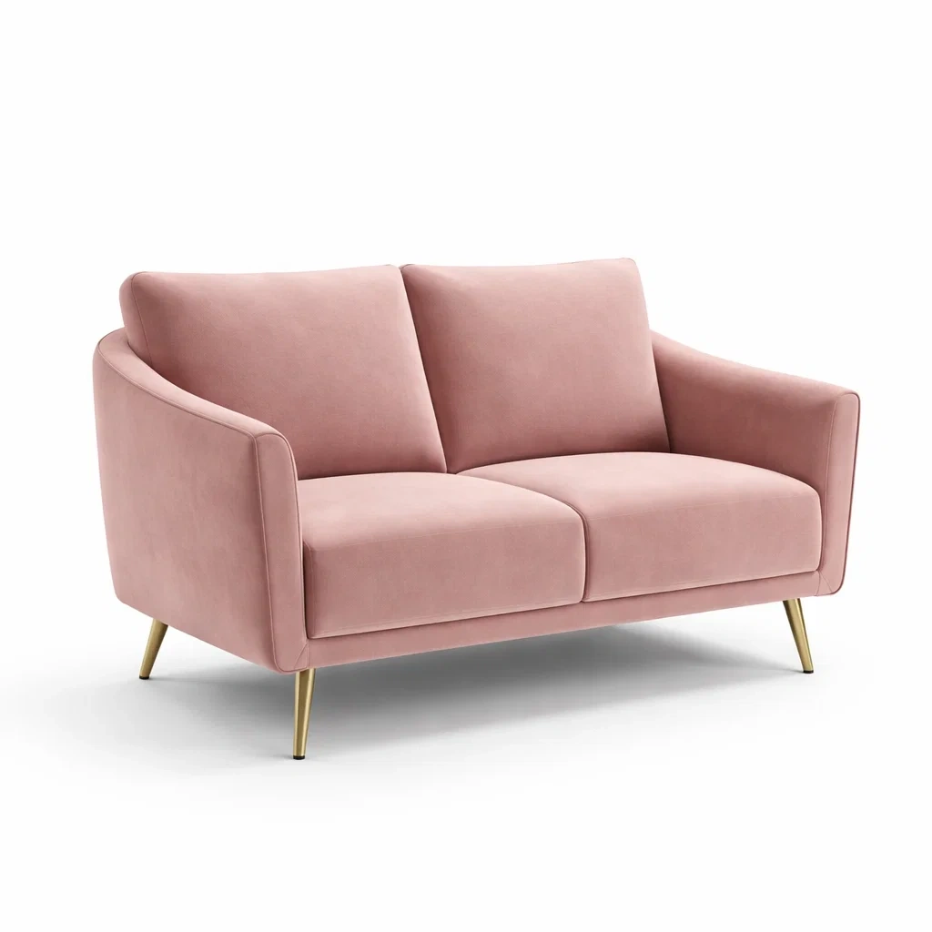 Ce canapé deux places est revêtu de velours rose et repose sur des pieds en métal. La structure est en métal, assurant robustesse et stabilité.