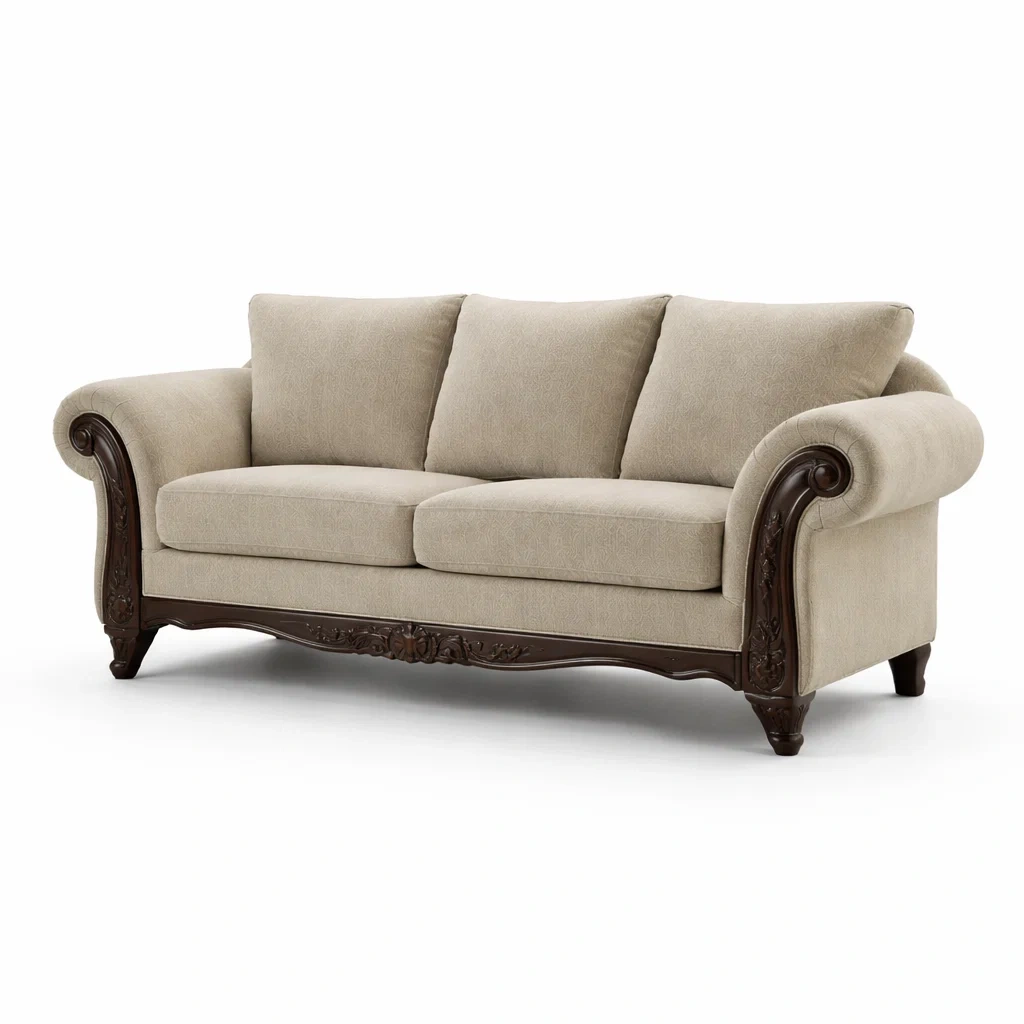 Canapé trois places en tissu beige avec bois sculpté