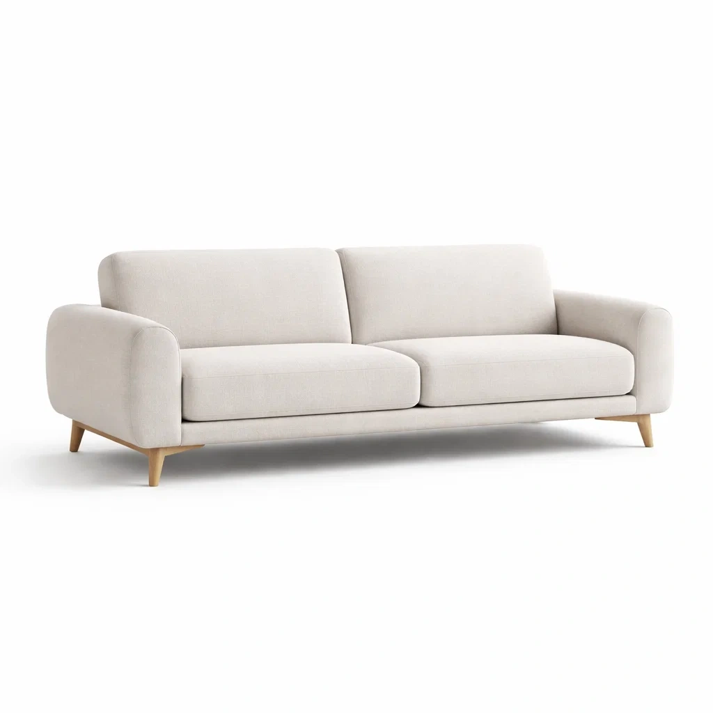 Canapé trois places en tissu beige avec pieds en bois de hêtre