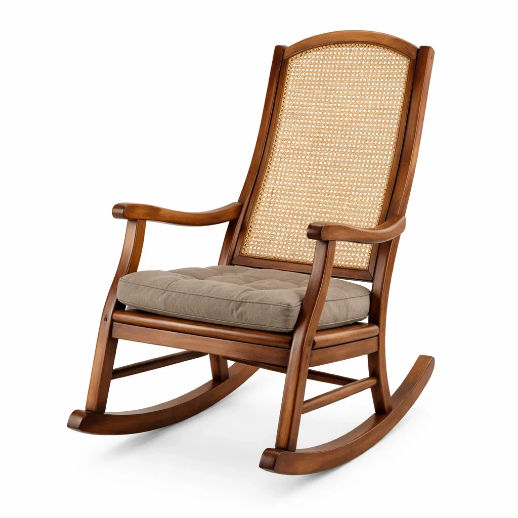 Matériaux : Bois massif, rotin, tissu en polyester pour le coussin.