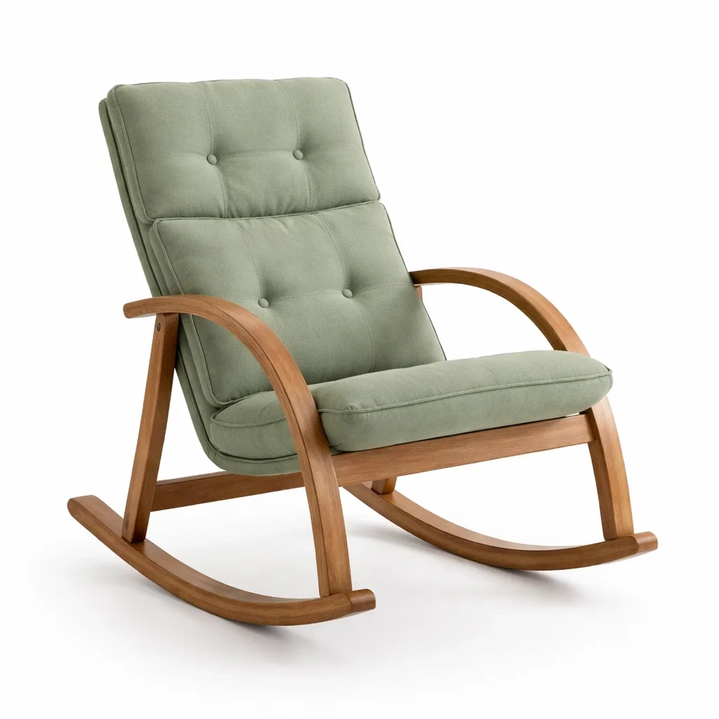 Ce fauteuil à bascule est doté d'une structure en bois massif avec un revêtement en tissu polyester vert. Le dossier est rembourré avec de la mousse polyuréthane. Il mesure 98 cm de hauteur, 60 cm de largeur et 90 cm de profondeur. Le poids du fauteuil est de 12 kg. La hauteur des accoudoirs est de 62 cm. Capacité de charge maximale : 120 kg.