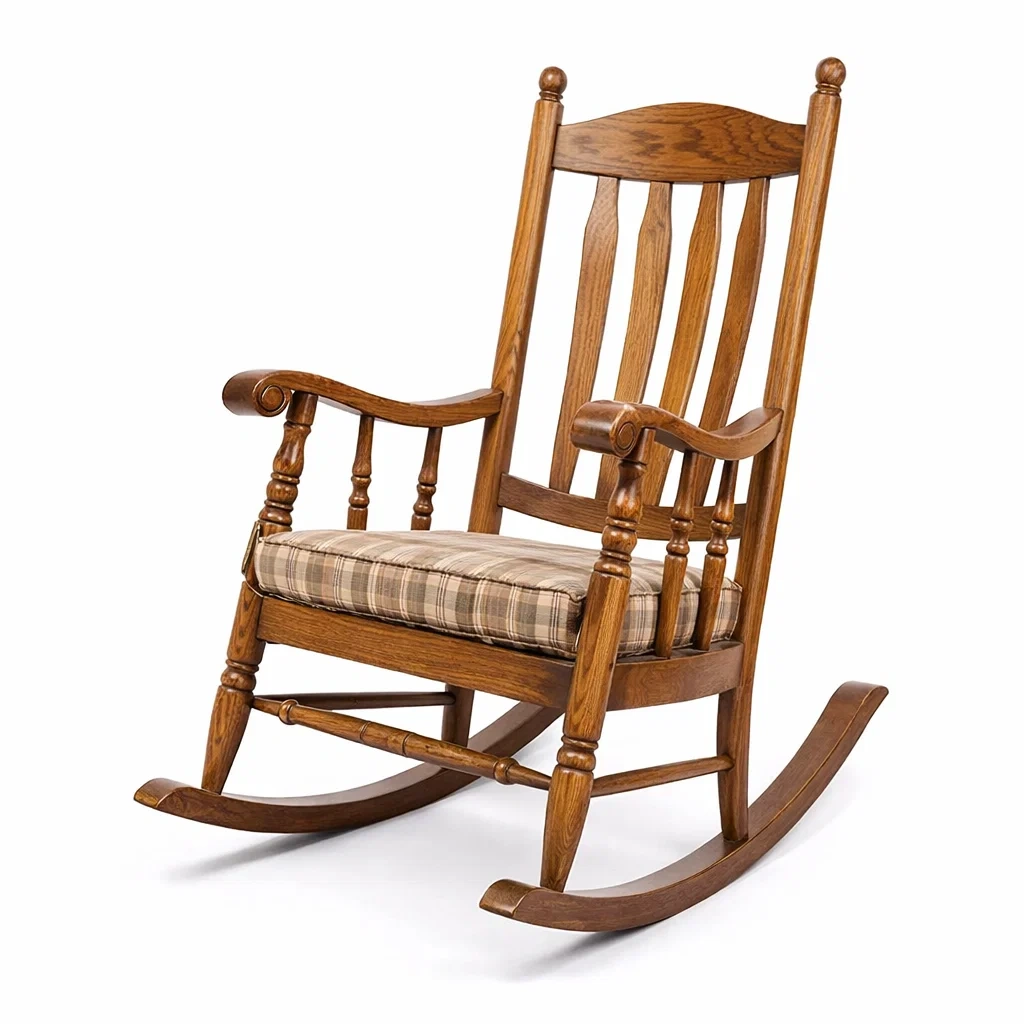 Chaise à bascule en chêne massif avec coussin en tissu polyester à carreaux. La structure en chêne offre une solidité, tandis que le coussin amovible en polyester comporte un motif à carreaux beiges et marron. Dimensions: Longueur 100 cm, Largeur 60 cm, Hauteur 92 cm. Poids net de la chaise: 10 kg. Fonction de bascule intégrée.