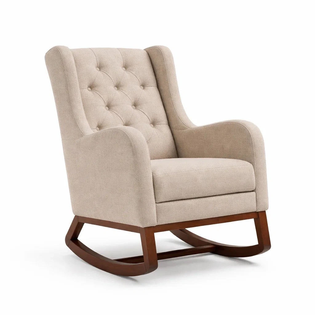 Ce fauteuil à bascule est doté d'une structure en bois de hêtre et d'un revêtement en tissu 100% polyester beige. Le rembourrage est en mousse polyuréthane pour un soutien adéquat.