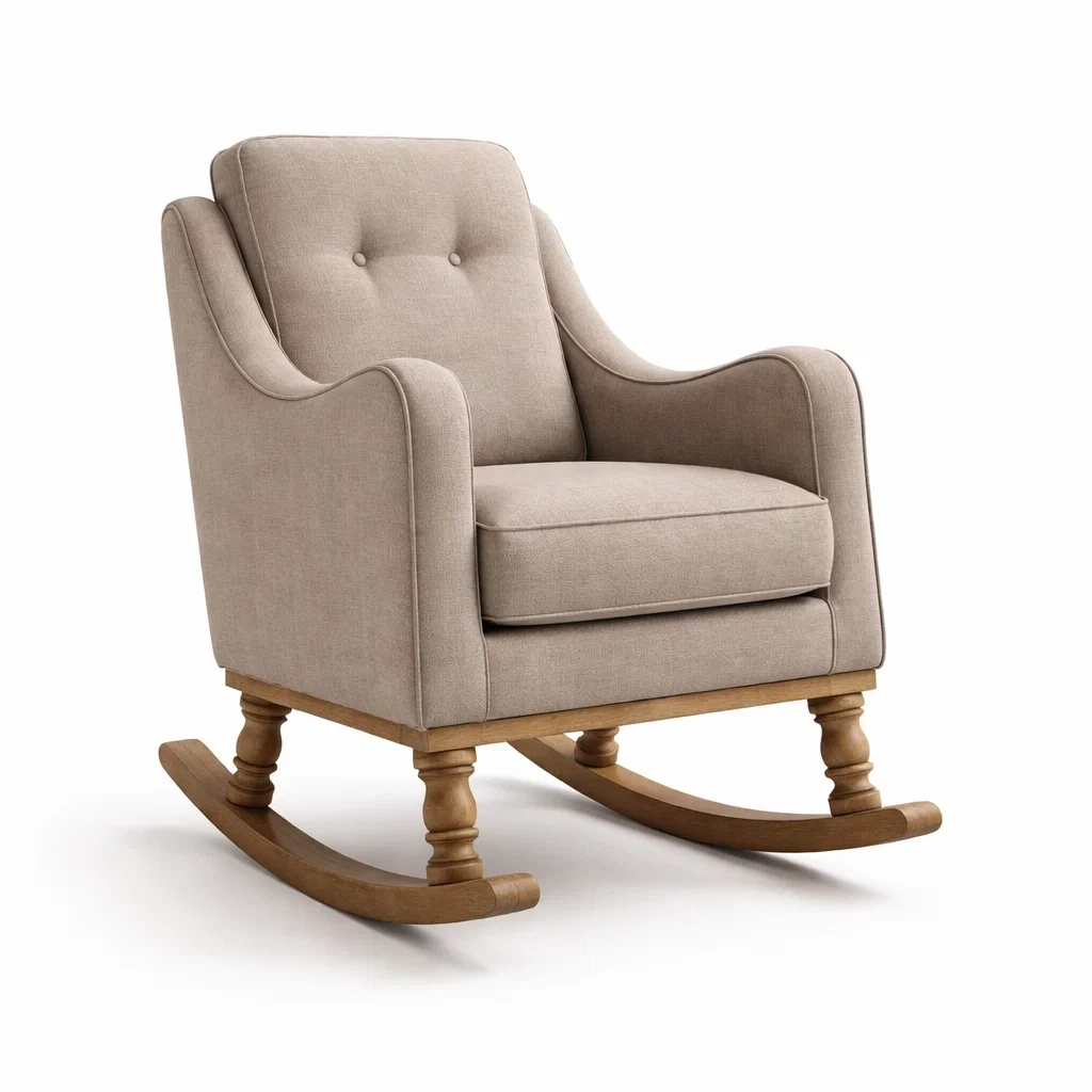 Le fauteuil à bascule est fabriqué avec un cadre en bois massif et recouvert de tissu en lin. Les dimensions sont de 85 cm de longueur, 70 cm de largeur, et 105 cm de hauteur, avec une hauteur d'assise de 45 cm. Ce fauteuil peut supporter jusqu'à 120 kg. Il dispose d'une fonction de bascule.