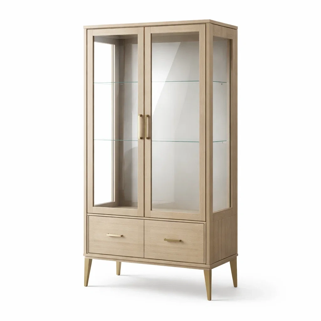 Structure : Deux portes vitrées, deux tiroirs inférieurs, trois étagères en verre ajustables