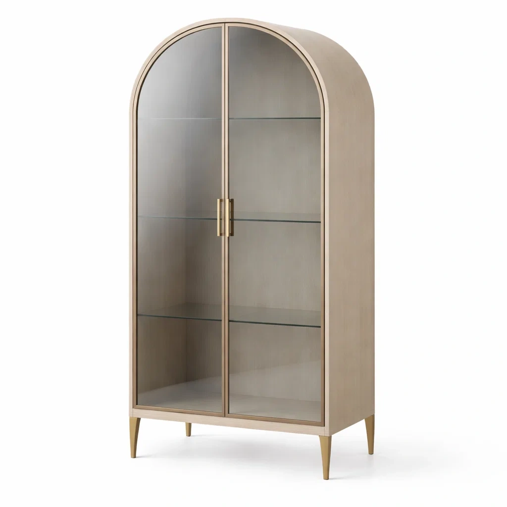 Portes en verre en forme d'arche avec cadre en bois, poignées métalliques dorées