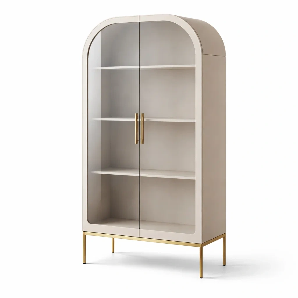 Vitrine en verre trempé avec structure en métal doré et bois beige